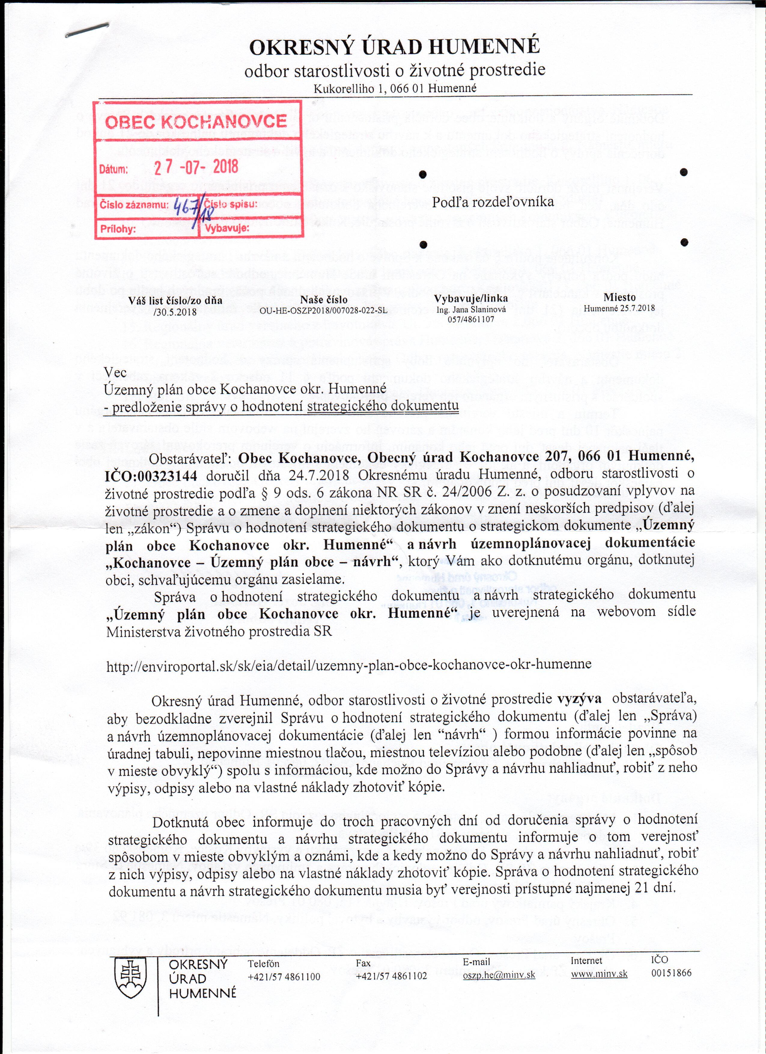 Strategický dokument " Územný plán obce Kochanovce okr Humenné " je k nahliadnutiu na Obecnom úrade v Kochanovciach, Kochanovce 207, okr. Humenné v čase úradných hodín. Z uvedeného dokumnetu je možné na vlastné náklady zhotoviť kópie, odpisy a poznámky.